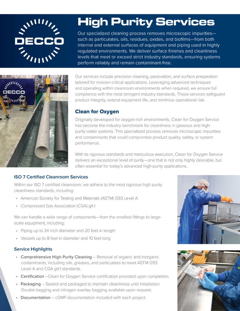 With its rigorous standards and meticulous execution, Clean for Oxygen Service delivers an exceptional level of purity—one that is not only highly desirable, but often essential for today’s advanced high-purity applications.